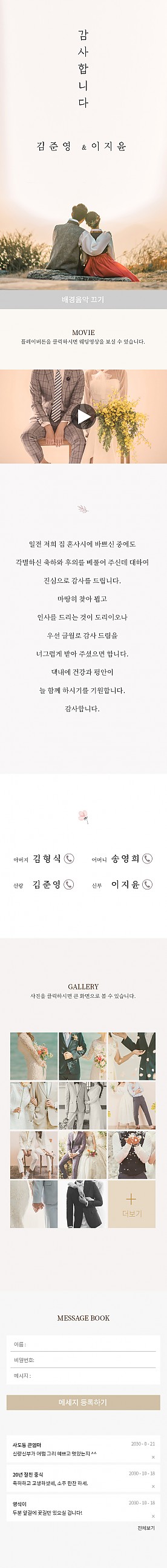 개인bgm, 개인감사영상, 웨딩갤러리등을 사용할 수 있는 디자인의 감사장입니다. 예식일에 촬영하신 영상을 등록하시면 감사와 존경, 감동을 생생하게 전하실 수 있습니다. (제작일 이후 2달간 사용 가능하며, 이후에는 자동 삭제됩니다.)