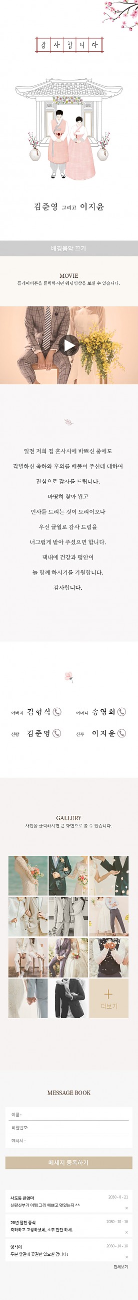 개인bgm, 개인감사영상, 웨딩갤러리등을 사용할 수 있는 디자인의 감사장입니다. 예식일에 촬영하신 영상을 등록하시면 감사와 존경, 감동을 생생하게 전하실 수 있습니다. (제작일 이후 2달간 사용 가능하며, 이후에는 자동 삭제됩니다.)